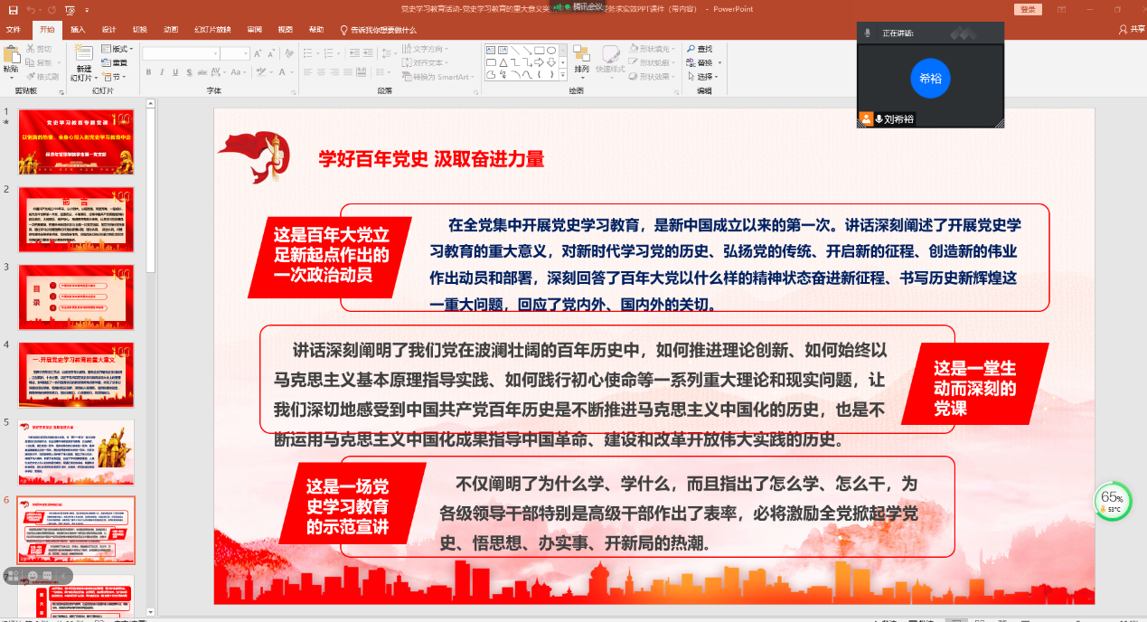 2021年3月26日,今年会jinnian官网学生第一党支部书记刘希裕做了题为《以饱满的热情,全身心投入到党史学习教育中去》的专题党课,支部全体党员参加了党课活动。