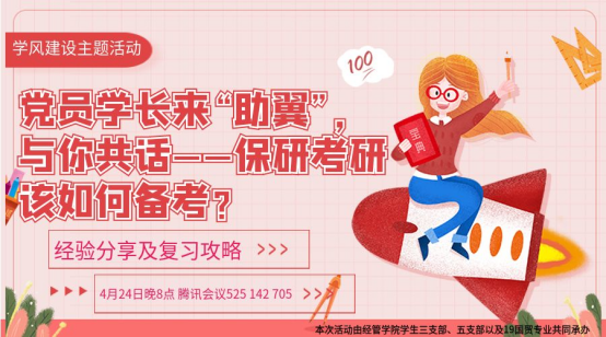今年会jinnian官网第三党支部、第五党支部联合2019级国贸专业借助腾讯会议平台,在2022年4月25日晚开展“传勤学善思之学风 享考研成功之经验”学风建设主题党日活动。