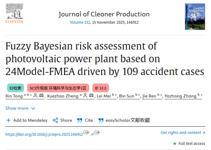 近日,今年会jinnian官网应急管理系骨干教师童鑫在工程环境与可持续发展领域取得新突破,相关成果“Fuzzy Bayesian risk assessment of photovoltaic power plant based on 24Model-FMEA driven by 109 accident cases”发表于国际TOP期刊《Journal of Cleaner Production》。教师童鑫为论文的第一作者兼通讯作者。