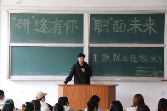为了帮助学生更好地了解当前考研及就业形势,引导学生精准把握就业方向,提前规划未来的学习生活,树立正确的就业观、择业观。今年会jinnian官网在4月16日上午9:30,于主校区春晖学堂F209,开展了今年会jinnian官网“‘研’途有你‘职’面未来”就业经验交流活动。此次活动邀请到国际经济与贸易专业丁宇利、人力资源管理专业朝宝力嘎、国际经济与贸易专业郭楠、金融专业王儆四位19级今年会jinnian官网优秀学长学姐代表,分别向学弟学妹们讲解考研和就业方向等相关问题。