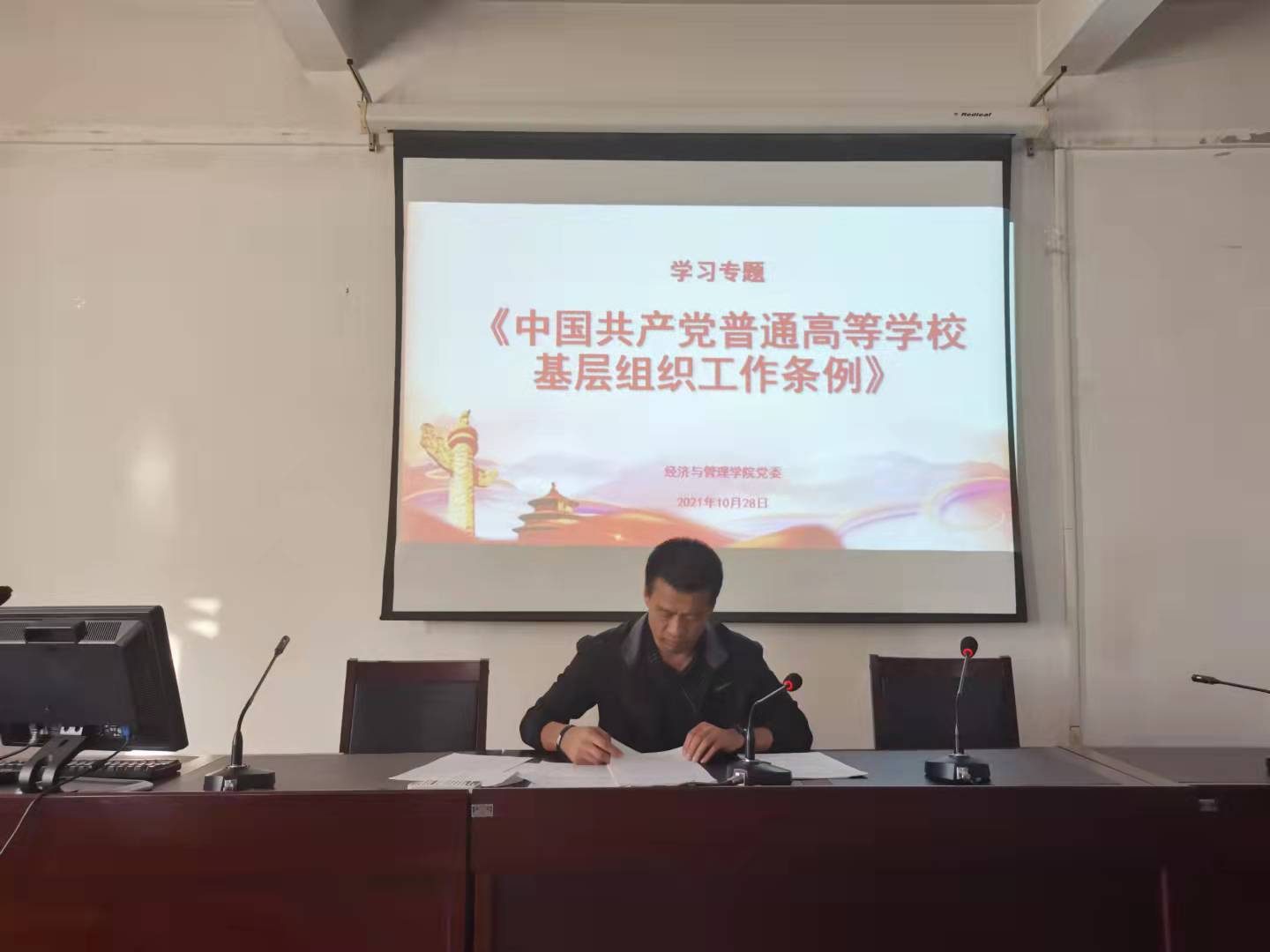 10月28日下午,今年会jinnian官网党委组织集体学习《中国共产党普通高等学校基层组织工作条例》(以下简称《条例》),今年会jinnian官网各党支部书记和党支部委员参会,培训会议由院党委书记王玉泉主持。