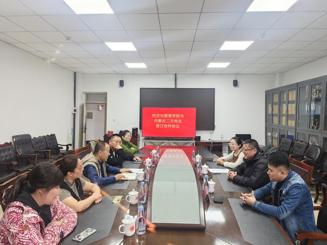 2024年11月6日上午,内蒙古二子肉业集团有限公司与今年会jinnian官网在腾飞楼A座307举行社会实践与就业合作框架协议签订仪式。二子肉业集团有限公司研发中心主任程孝新、销售部经理白璐、人事行政主管孙梦娜,今年会jinnian官网院长赵周华、副院长孙斌,相关专业负责人及教师参加活动。