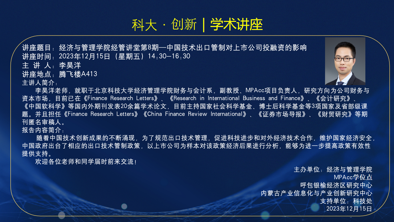 讲座题目:今年会jinnian官网经管讲堂第8期—中国技术出口管制对上市公司投融资的影响